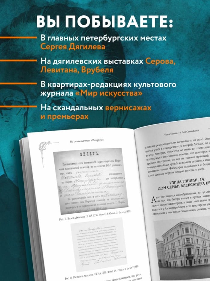 Прогуливаясь вместе с этой книгой по улицам Петербурга, вы узнаете, где находилась квартира, в которой вырос Сергей Дягилев, в каком именно доме появилась идея о создании «Русских сезонов», ставших громким инфоповодом для всей Европы. Вы сможете увидеть дома северной столицы, где когда-то проходили выставки таких великих художников, как Серов, Левитан, Врубель и многих других, прежде чем отправить их работы в другие страны вместе с Сергеем Дягилевым.