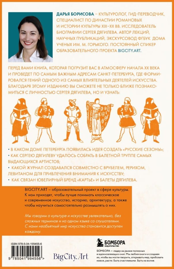 Превосходное сочетание искусства начала XX века и уникального путеводителя по Санкт-Петербургу — книга «По следам Дягилева в Петербурге. Адреса великих идей». Авторы книги — Дарья Борисова, один из спикеров культурно-образовательного проекта BigCity.Art, а также его создатели Елизавета Зиновьева и Наталья Карасева приглашают читателя отправиться в путешествие по местам, где рождались новаторские идеи и происходили судьбоносные встречи, ставшие ключевыми точками в истории не только русского, но и мирового искусства.