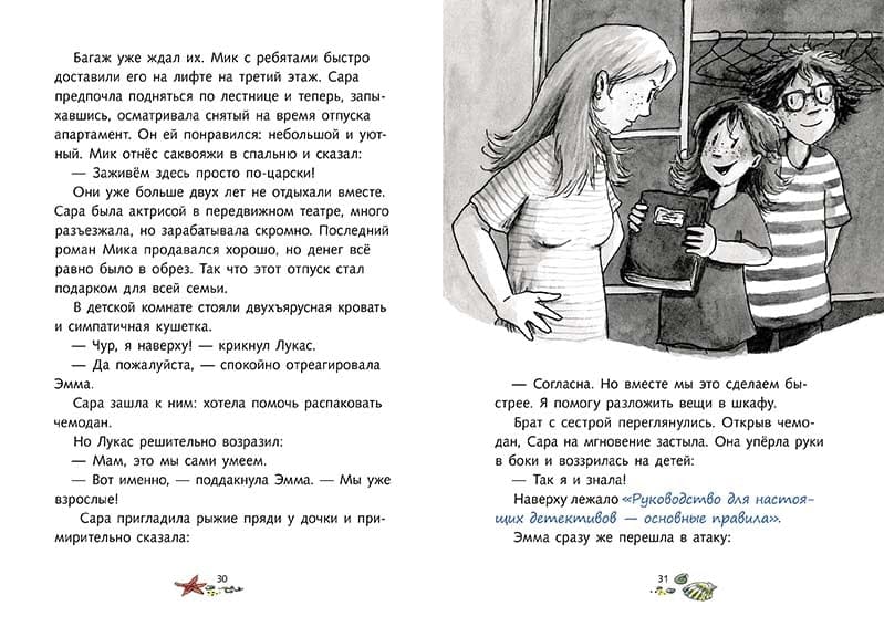 Как хорошо иметь при себе "Руководство для настоящих детективов – основные правила" двоюродного дедушки Теодора Янссена. Недолго думая, Эмма с Лукасом приступают к расследованию нового дела. Им помогает девочка Лиза с прикольной внешностью – с обритой наполовину головой и серёжкой из крашеных чаячьих перьев. Вместе они не только находят свои велосипеды и выслеживают главаря коварных похитителей, но и спасают жизнь полицейскому.