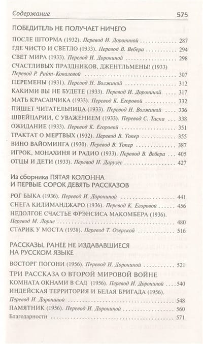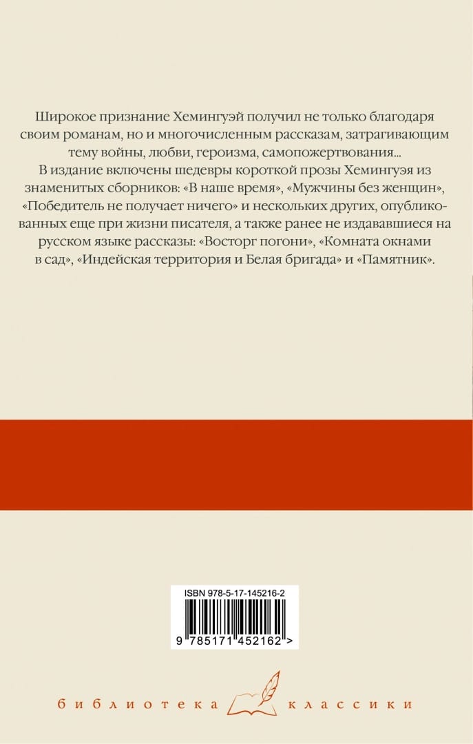 Широкое признание Хемингуэй получил не только благодаря своим романам, но и многочисленным рассказам, затрагивающим тему войны, любви, героизма, самопожертвования... В издание включены шедевры короткой прозы Хемингуэя из знаменитых сборников «В наше время», «Мужчины без женщин», «Победитель не получает ничего» и нескольких других, опубликованных еще при жизни писателя, а также ранее не издававшиеся на русском языке рассказы: «Восторг погони», «Индейская территория и Белая бригада», «Памятник» и «Комната окнами в сад».
