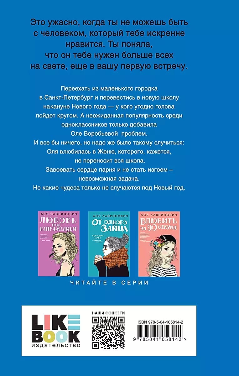 Переехать из маленького городка в Санкт-Петербург и перевестись в новую школу накануне Нового года — у кого угодно голова пойдет кругом. А неожиданная популярность среди одноклассников только добавила Оле Воробьевой проблем. И все бы ничего, но надо же было такому случиться: Оля влюбилась в Женю, которого, кажется, не переносит вся школа. Завоевать сердце парня и не стать изгоем — невозможная задача. Но какие чудеса только не случаются под Новый год. Ася Лавринович – молодой автор, получивший широкую известность благодаря публикации на Wattpad и Litnet.