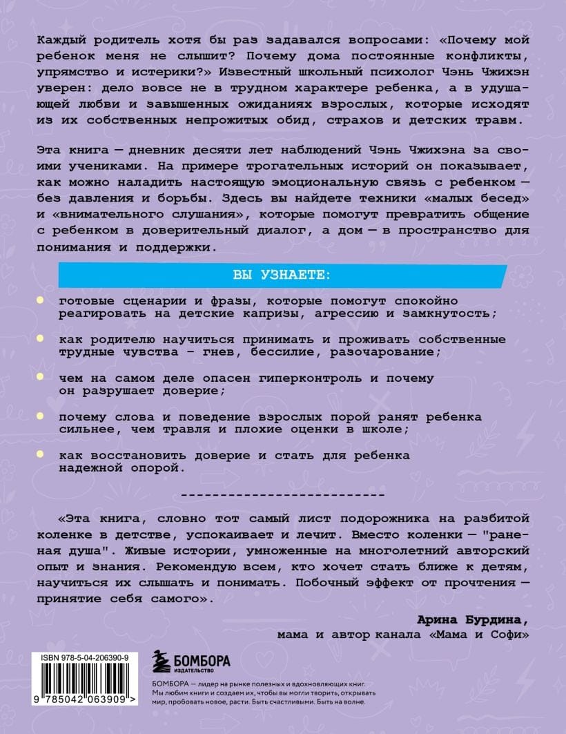 Каждый родитель хотя бы раз задавался вопросами: «Почему мой ребенок меня не слышит? Почему дома постоянные конфликты, упрямство и истерики?» Известный школьный психолог Чэнь Чжихэн уверен: дело вовсе не в трудном характере ребенка, а в удушающей любви и завышенных ожиданиях взрослых, которые исходят из их собственных непрожитых обид, страхов и детских травм.