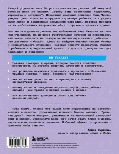 Эта книга — дневник десяти лет наблюдений Чэнь Чжихэна за своими учениками. На примере трогательных историй он показывает, как можно наладить настоящую эмоциональную связь с ребенком — без давления и борьбы. Здесь вы найдете техники «малых бесед» и «внимательного слушания», которые помогут превратить общение с ребенком в доверительный диалог, а дом — в пространство для понимания и поддержки.