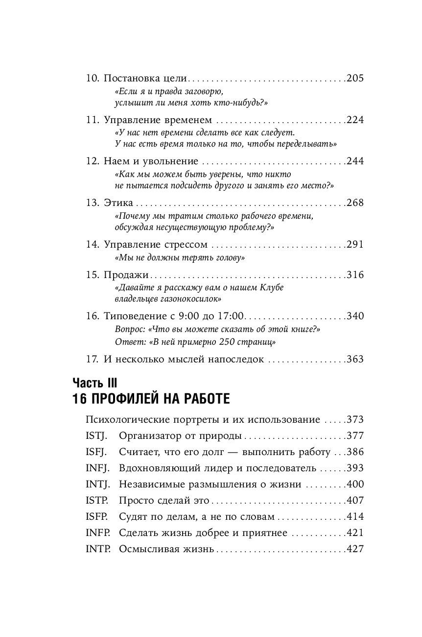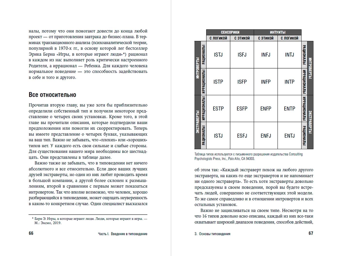Нравится нам это или нет, мы не похожи друг на друга. Если не принять этот факт, можно потратить много сил и времени на споры, обиды и конфликты дома и в рабочем коллективе: кого-то злит привычка коллеги думать вслух, другой обижается, если босс не комментирует отчет, а особенность третьего — думать очень долго и не торопить события — интерпретируется как отсутствие мотивации. Атмосфера в команде становится токсичной, а эффективность работы падает. Авторы книги утверждают, что все наши различия могут принести пользу, если их превратить в инструменты развития и взаимодействия. Опираясь на типологическую теорию Майерс—Бриггс, они рассказывают об особенностях каждого типа, сильных и слабых сторонах и о способах взаимодействия друг с другом. Вы сможете глубже понимать себя, своих близких, партнеров, друзей, коллег и просто знакомых, прогнозировать их поведение и раскрывать творческий и рабочий потенциал.