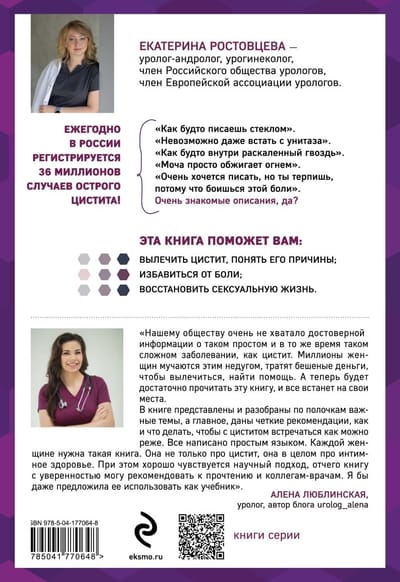 Боль, жжение, частое мочеиспускание — и это еще не весь список симптомов, которые «дарит» нам это заболевание. Цистит не угрожает жизни, но может основательно ее испортить. А некоторые его виды без своевременного лечения приводят к опасным осложнениям — разрушению мочевого пузыря и поражению почек. В этой книге врач-уролог Екатерина Ростовцева расскажет все, что нужно знать о цистите, его причинах, симптомах и эффективных методах лечения. Автор объяснит, почему воспаление мочевого пузыря — это «женская» болезнь, какие факторы его провоцируют и что нужно предпринять, чтобы неприятные ощущения больше не возвращались. Вы узнаете: · Что делать при первых симптомах цистита? · Какие виды этого заболевания считаются опасными? · Какие методы лечения эффективны, а какие — бесполезны и даже вредны? · Как избежать неприятных последствий полового акта? · Какие психологические факторы повышают риск цистита? · Как лечиться при беременности? Эта книга не заменит консультации врача, но зато поможет определить характер заболевания, защитит от опасных заблуждений о цистите и покажет инструменты борьбы с ним.