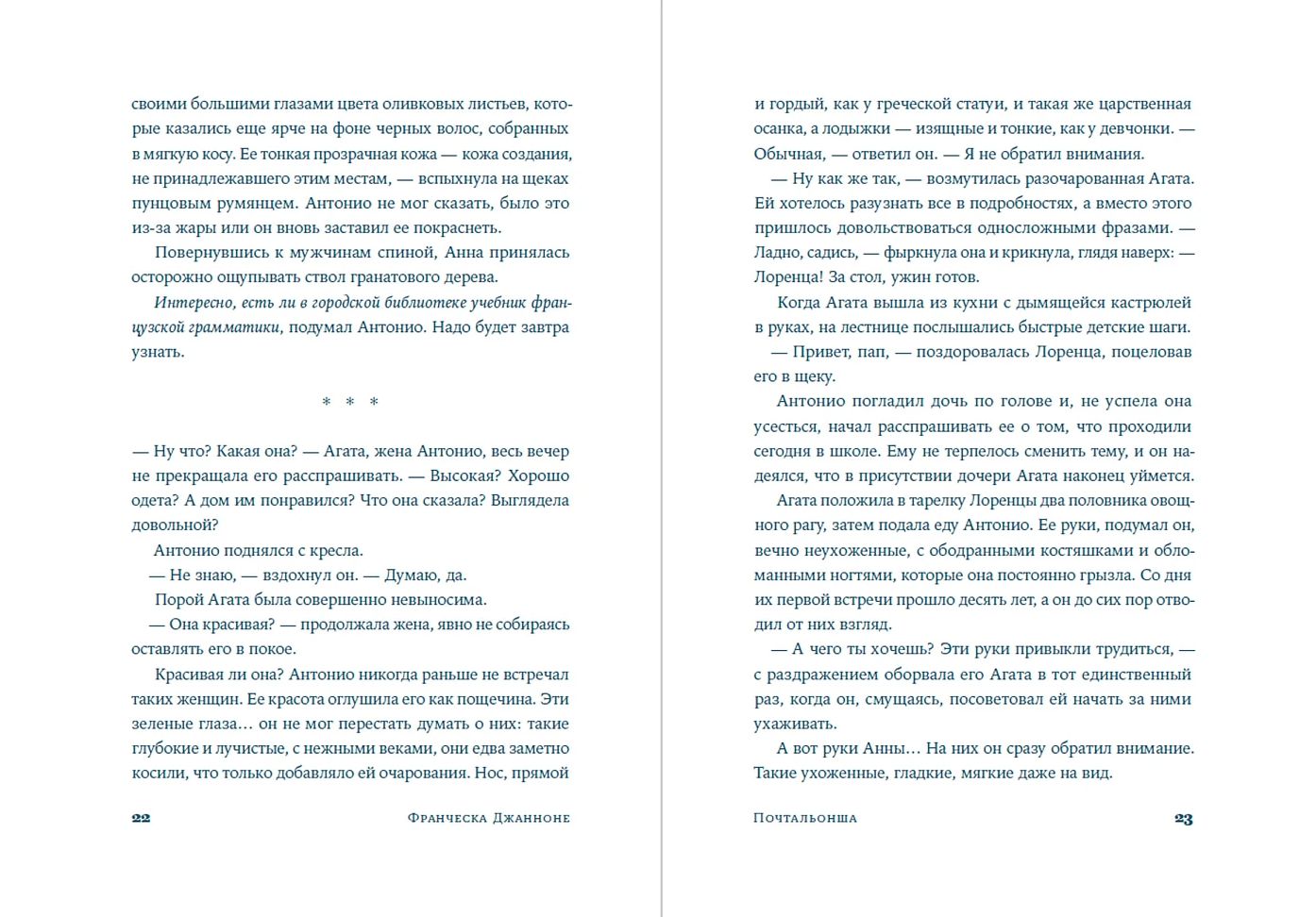 Действие романа Франчески Джанноне происходит на родине автора, Лиццанелло, в Саленто (Апулия, Италия), куда в июне 1934 года приезжает северянка Анна со своим мужем, южанином Карло, который очень рад вернуться в родные места, и маленьким сыном. Для местных Анна навсегда останется «иностранкой», угловатой своевольной гордячкой, острой на язык и не желающей следовать консервативным традициям Юга, этим вековым неписанным законам, сковывающим южных женщин. А для Антонио, старшего брата Карло, его жена, прекрасная, как античная статуя, станет любовью с первого взгляда. Год спустя, в 1935 году, Анна совершает нечто поистине революционное: она участвует в почтовом конкурсе, побеждает в нем и становится первым почтальоном Лиццанелло. Эта новость заставляет женщин воротить от нее носы и вызывает насмешки мужчин. «Это не продлится долго», — язвит кто-то. А вместо этого на протяжении более двадцати лет Анна станет невидимой нитью, объединяющей жителей страны. Сначала пешком, а потом на велосипеде она будет развозить письма солдат с фронта, открытки эмигрантов, послания тайных любовников. Сама того не желая – но, прежде всего, безо всякого на то желания общества – почтальонша Анна многое изменит в Лиццанелло.
