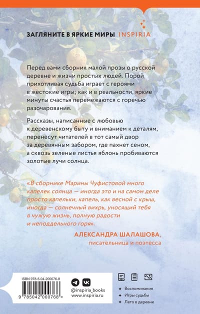 Рассказы, написанные с любовью к деревенскому быту и вниманием к деталям, перенесут читателей в тот самый двор за деревянным забором, где пахнет сеном, а сквозь зеленые листья яблонь пробиваются золотые лучи солнца.