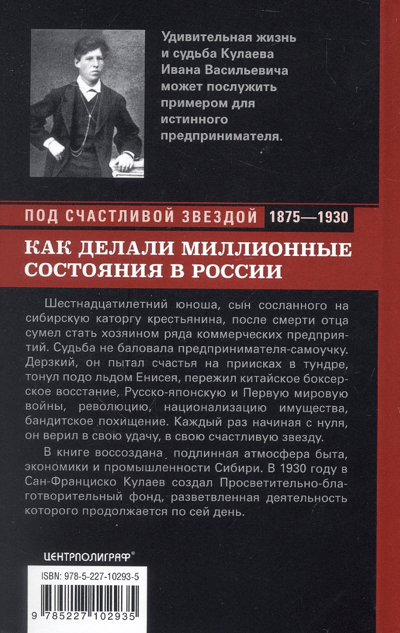Удивительная жизнь и судьба Ивана Васильевича Кулаева может послужить примером для истинного предпринимателя. Шестнадцатилетний юноша, сын сосланного на сибирскую каторгу крестьянина, после смерти отца сумел стать хозяином ряда коммерческих предприятий. Судьба не баловала предпринимателя-самоучку. Дерзкий, он пытал счастья на приисках в тундре, тонул подо льдом Енисея, пережил китайское боксерское восстание, Русско-японскую и Первую мировую войну, революцию, национализацию имущества, бандитское похищение. Каждый раз начиная с нуля, он верил в свою удачу, в свою счастливую звезду. В книге воссоздана подлинная атмосфера быта, экономики и промышленности Сибири начала века.