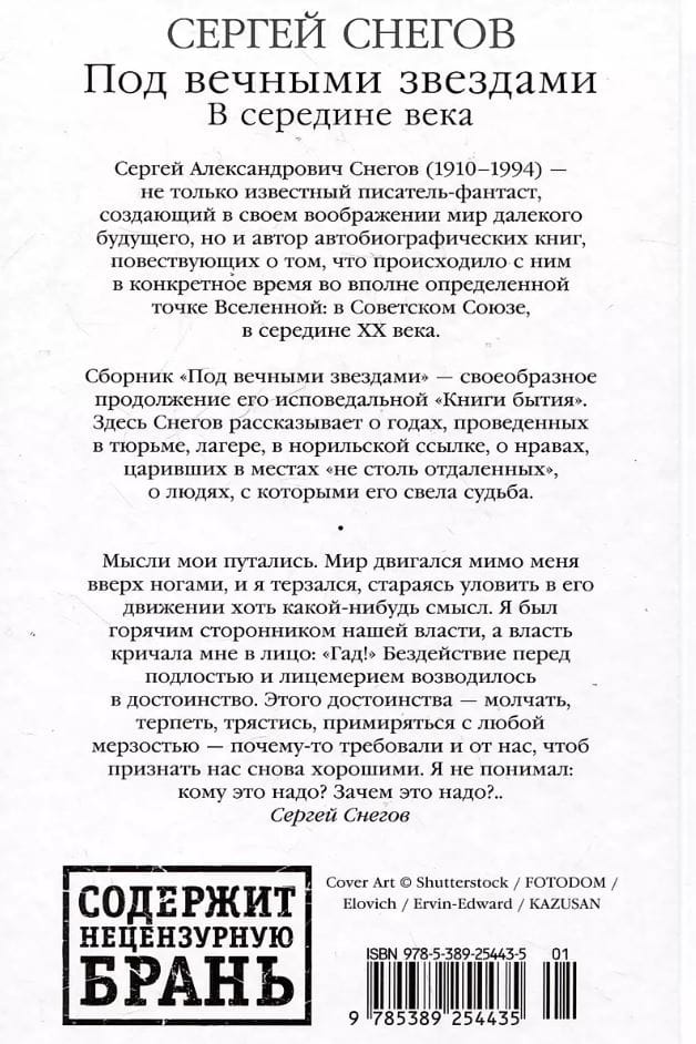 Сергей Александрович Снегов (1910–1994) — не только известный писатель-фантаст, создающий в своем воображении мир далекого будущего, но и автор автобиографических книг, повествующих о том, что происходило с ним в конкретное время во вполне определенной точке Вселенной: в Советском Союзе, в середине XX века. Сборник «Под вечными звездами» — своеобразное продолжение его исповедальной «Книги бытия». Здесь Сергей Снегов рассказывает о годах, проведенных в тюрьме, лагере, в норильской ссылке, о нравах, царивших в местах «не столь отдаленных», о людях, с которыми его свела судьба.