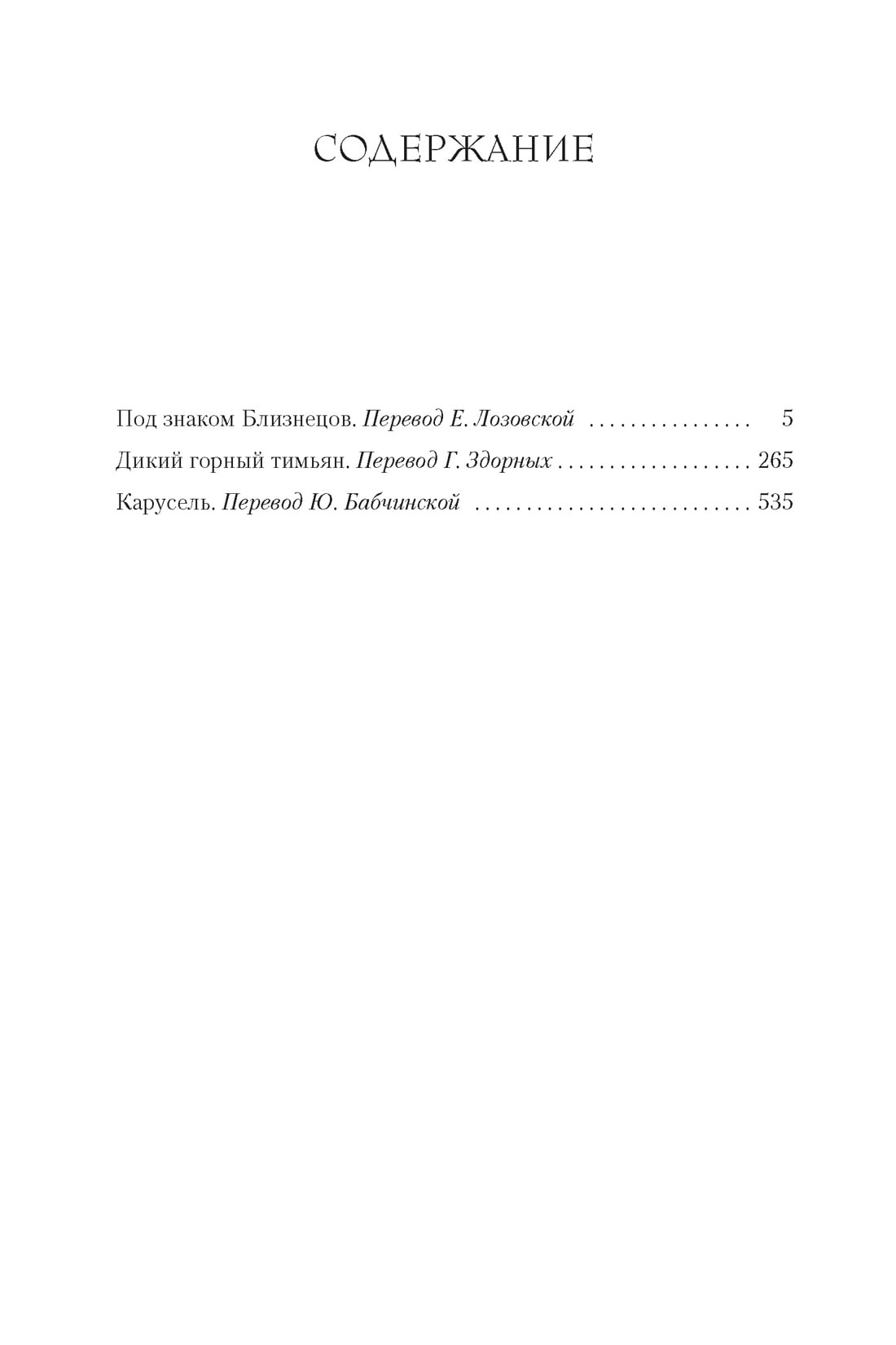 Книги Розамунды Пилчер (1924–2019) знают и любят во всем мире. Ее романы незамысловаты и неторопливы, зато в них много подлинного тепла и сердечности. Кредо писательницы можно охарактеризовать фразой: "У хороших людей всегда все будет хорошо", — и в данном случае это один из столпов устойчивого читательского успеха. В настоящем сборнике представлены три романа: "Под знаком Близнецов", "Дикий горный тимьян", "Карусель". Героини первого из них, разлученные в детстве сестры-близнецы, никогда не слышали друг о друге, и вот судьба сводит их вместе. Отчего бы не воспользоваться своим удивительным сходством? Виктория и Оливер, герои второй книги, встречаются после долгой разлуки и отправляются в старинное шотландское поместье, выдавая себя за мужа и жену... А в последнем романе действие происходит на корнуолльском побережье. Умная и независимая Пруденс приезжает сюда из скучного Лондона, не подозревая, что вскоре жизнь закружит ее, словно на волшебной карусели...