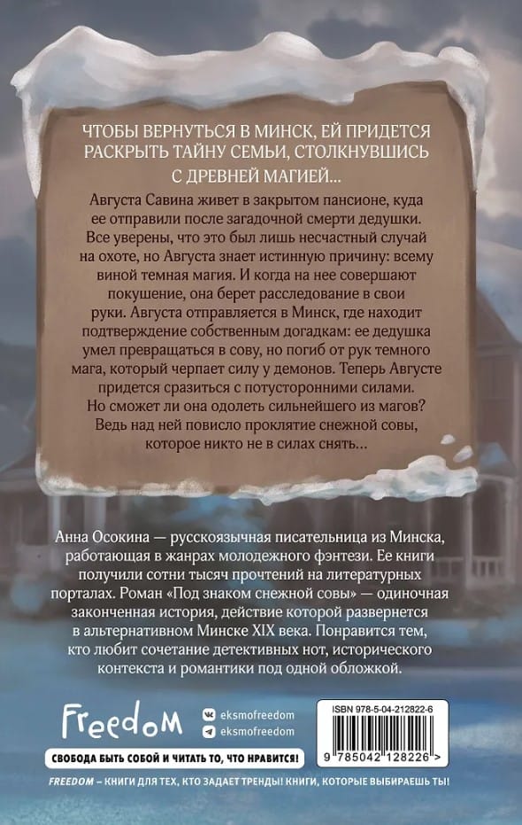 Августа Савина живет в закрытом пансионе для девиц, куда ее отправили после загадочной смерти дедушки. Все уверены, что это был лишь несчастный случай на охоте, но Августа знает истинную причину: всему виной темная магия. И когда на нее совершает нападение злодей, она берет расследование в свои руки, чтобы найти ответы на терзающие ее вопросы. Августа отправляется в Минск, где находит подтверждение собственным догадкам: ее дедушка умел превращаться в сову, но погиб от рук темного мага, который черпает силу у демонов. Теперь Августе придется сразиться с потусторонними силами, найти верных союзников и любовь. Но сможет ли она одолеть сильнейшего из магов?..