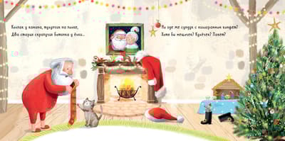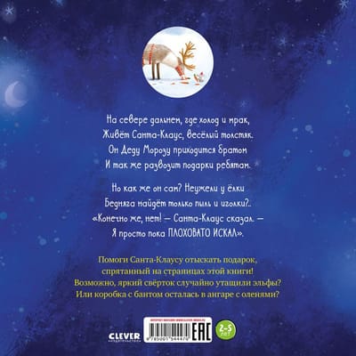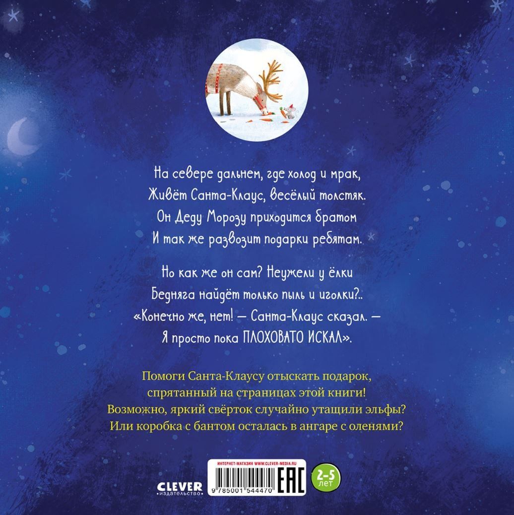 На севере дальнем, где холод и мрак,  Живёт Санта-Клаус, весёлый толстяк.  Он Деду Морозу приходится братом  И так же развозит подарки ребятам.  Но как же он сам? Неужели у ёлки  Бедняга найдёт только пыль и иголки?..  Конечно же, нет - Санта Клаус сказал. -  Я просто пока плоховато искал.  Помоги Санта-Клаусу отыскать подарок, спрятанный на страницах этой книги! Возможно, яркий свёрток случайно утащили эльфы? Или коробка с бантом осталась в ангаре с летающими оленями?