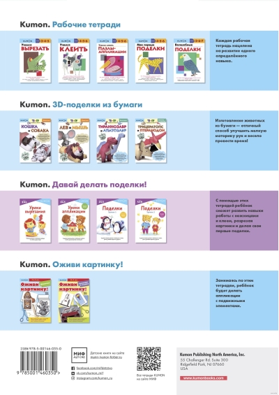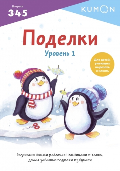 Этот сборник забавных поделок - продолжение серии «Давай делать поделки!», основанной на методике обучения KUMON. В тетради 39 заданий. Сначала малыш будет вырезать и складывать картинки, чтобы получились простые поделки - зайка с двигающимися ушками, поросенок на качелях, мишка, который чистит зубы. Постепенно задания усложняются, помимо ножниц в ход пойдет и клей. Ребенок сам сделает маску льва, бинокль и даже пылесос. В последних уроках предлагается создать объемные поделки. Продолжить развивать навык работы с ножницами и клеем можно с тетрадью «Поделки. Уровень 2».