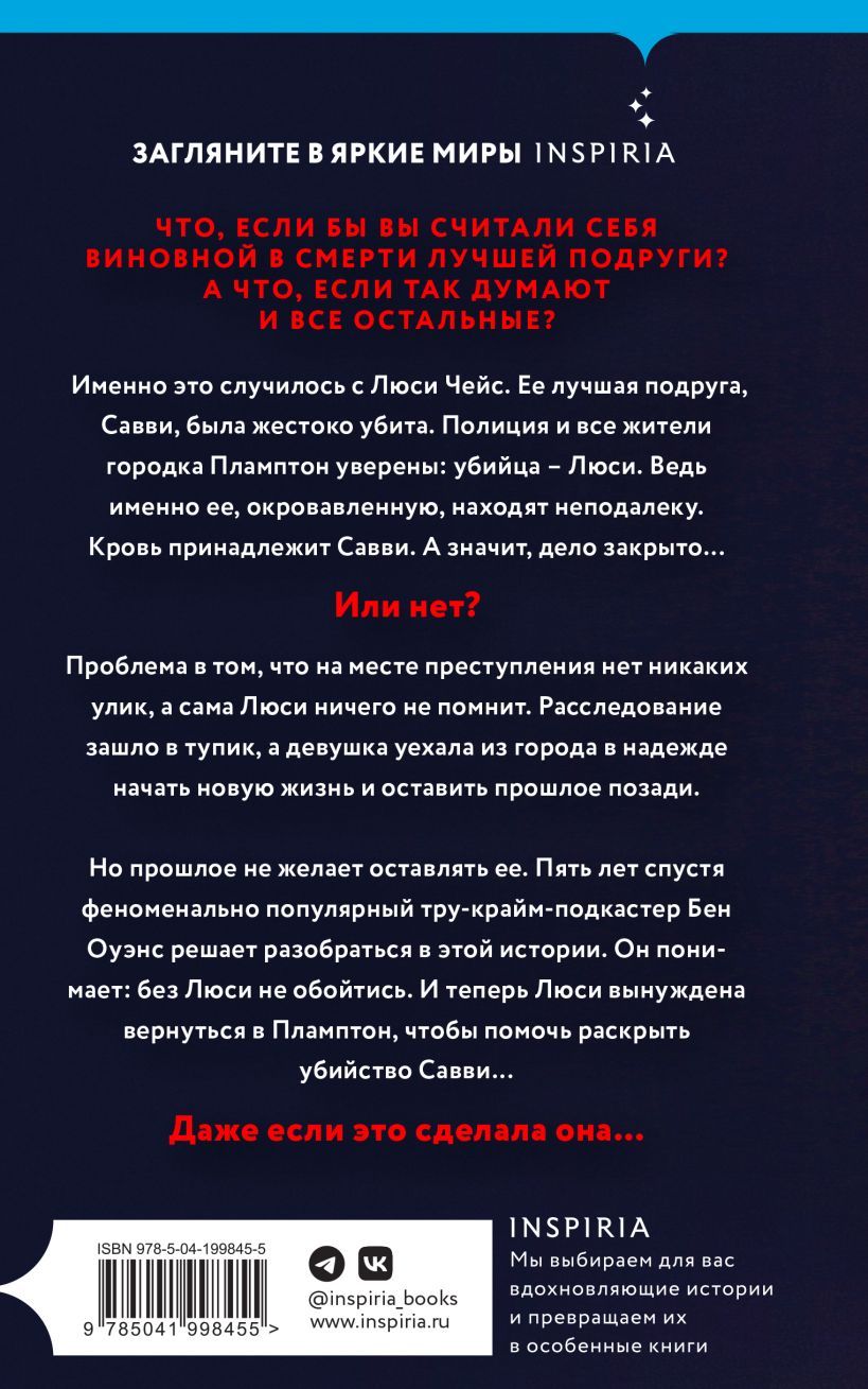 Но прошлое не отпускает ее. Пять лет спустя Бен Оуэнс, автор феноменально популярного тру-крайм подкаста «Слушай ложь», решает разобраться в этой истории. Он понимает: без Люси не обойтись. И теперь Люси вынуждена вернуться в Пламптон, чтобы помочь раскрыть убийство Савви. Даже если убийца — она сама…