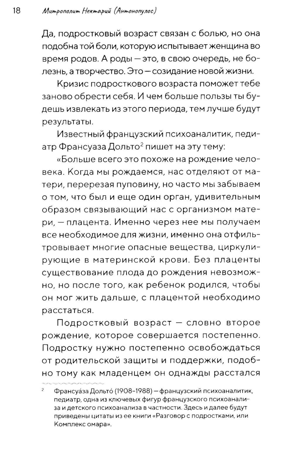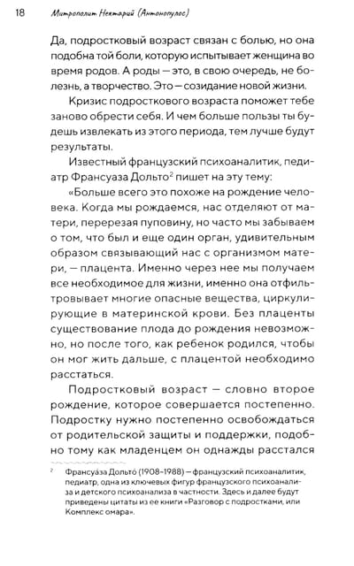 Митрополит Нектарий Арголидский (Антонопулос) - один из тех, кто не просто болеет душой за молодое поколение, а помогает подросткам найти дорогу к храму, понять себя и задуматься над смыслом жизни. «Подростки на пути к взрослению» - книга, которая родилась из многочисленных бесед с ребятами подросткового возраста. Владыка Нектарий, обсуждая с ними самые разные проблемы, разбирает многие серьезные, непростые вопросы, те самые, которые они, возможно, постесняются задать родителям. В формате доверительной беседы в книге идет разговор о том, что такое подростковый возраст, какие изменения встречаются на этом пути, об отношениях с родителями и друзьями, о взаимоотношениях с противоположным полом, о важности и о святости материнства, о вреде аборта, затронуты темы дурных компаний, неудачного опыта, опасных моментов в жизни молодежи. О том, как важно быть самим собой, о создании семьи, о выборе профессии - обо всем том, что интересует, тревожит подростка, - говорит владыка Нектарий на страницах этой книги.