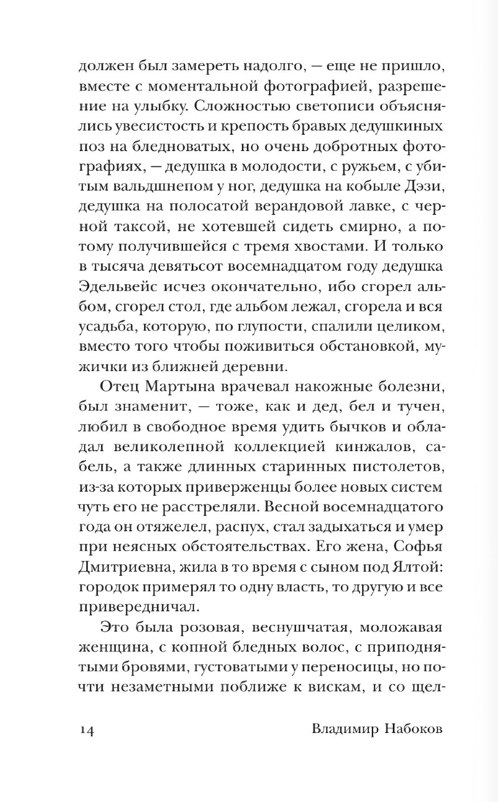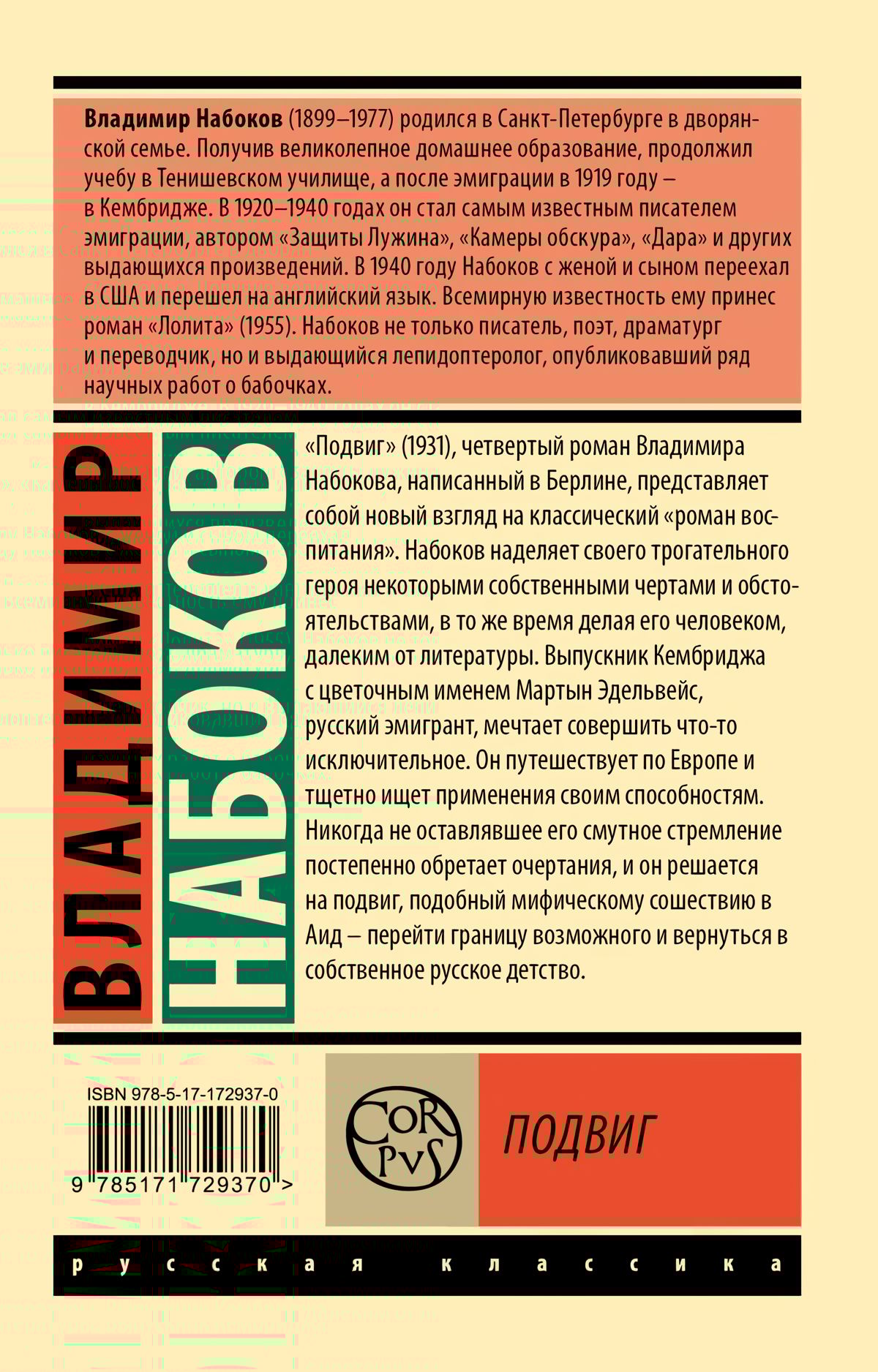 «Подвиг» (1931), четвертый роман Владимира Набокова, написанный в Берлине, представляет собой новый взгляд на классический «роман воспитания». Набоков наделяет своего трогательного героя некоторыми собственными чертами и обстоятельствами, в то же время делая его человеком, далеким от литературы. Выпускник Кембриджа с цветочным именем Мартын Эдельвейс, русский эмигрант, мечтает совершить что‑то исключительное. Он путешествует по Европе и тщетно ищет применения своим способностям. Никогда не оставлявшее его смутное стремление постепенно обретает очертания, и он решается на подвиг, подобный мифическому сошествию в Аид, — перейти границу возможного и вернуться в собственное русское детство.