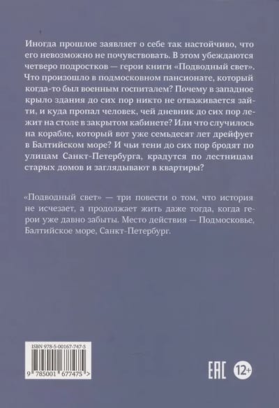 Иногда прошлое заявляет о себе так настойчиво, что его невозможно не почувствовать. В этом убеждаются четверо подростков — герои книги «Подводный свет». Что произошло в подмосковном пансионате, который когда-то был военным госпиталем? Почему в западное крыло здания до сих никто не отваживается зайти, и куда пропал человек, чей дневник до сих пор лежит на столе в закрытом кабинете? Или что случилось на корабле, который вот уже семьдесят лет дрейфует в Балтийском море? И чьи тени до сих пор бродят по лестницам старых домов и заглядывают в квартиры в Санкт Петербурге?