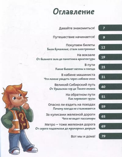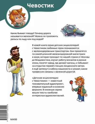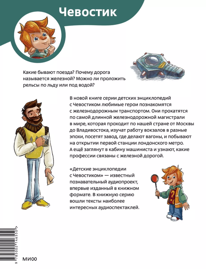 Какие бывают поезда? Почему дорога называется железной? Можно ли проложить рельсы по льду или под водой? В новой книге серии детских энциклопедий Чевостик и Дядя Кузя познакомятся с историей и устройством поездов, железных дорог и метро. Они проедутся по самой длинной железнодорожной магистрали в мире, побывают на открытии первой станции лондонского метро и на заводе, где делают вагоны, узнают, чем дилижанс отличается от шарабана (и что это вообще такое), почему поезда не сталкиваются и как по железной дороге перевозят грузы. А еще наши герои познакомятся с железнодорожными профессиями и даже заглянут в кабину машиниста.