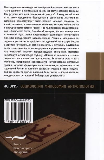 В своей книге Анатолий Решетников реконструирует тысячелетнюю историю основных понятий, связанных с политическим величием, которые используются в дискурсе постсоветской России и ее политических предшественников — Советского Союза, Российской империи, Московского царства и Киевской Руси. Автор прослеживает важнейшие исторические моменты дискурсивного взаимодействия России с западными соседями и указывает на проблемы дискурсивной интеграции России с Европой, которые были особенно заметны и актуальны в XVIII и XIX веках — в период, когда великодержавное управление установилось как отдельный институт международных отношений.