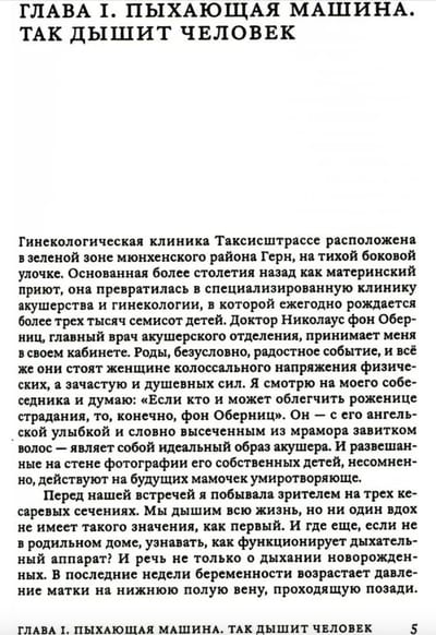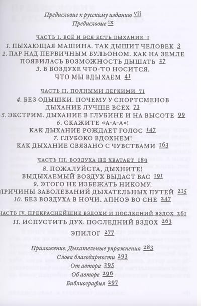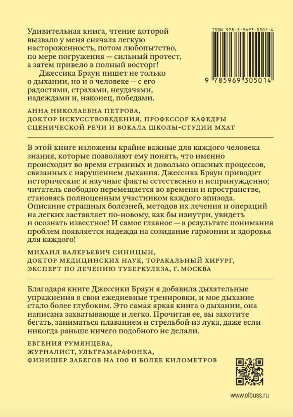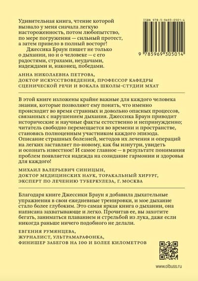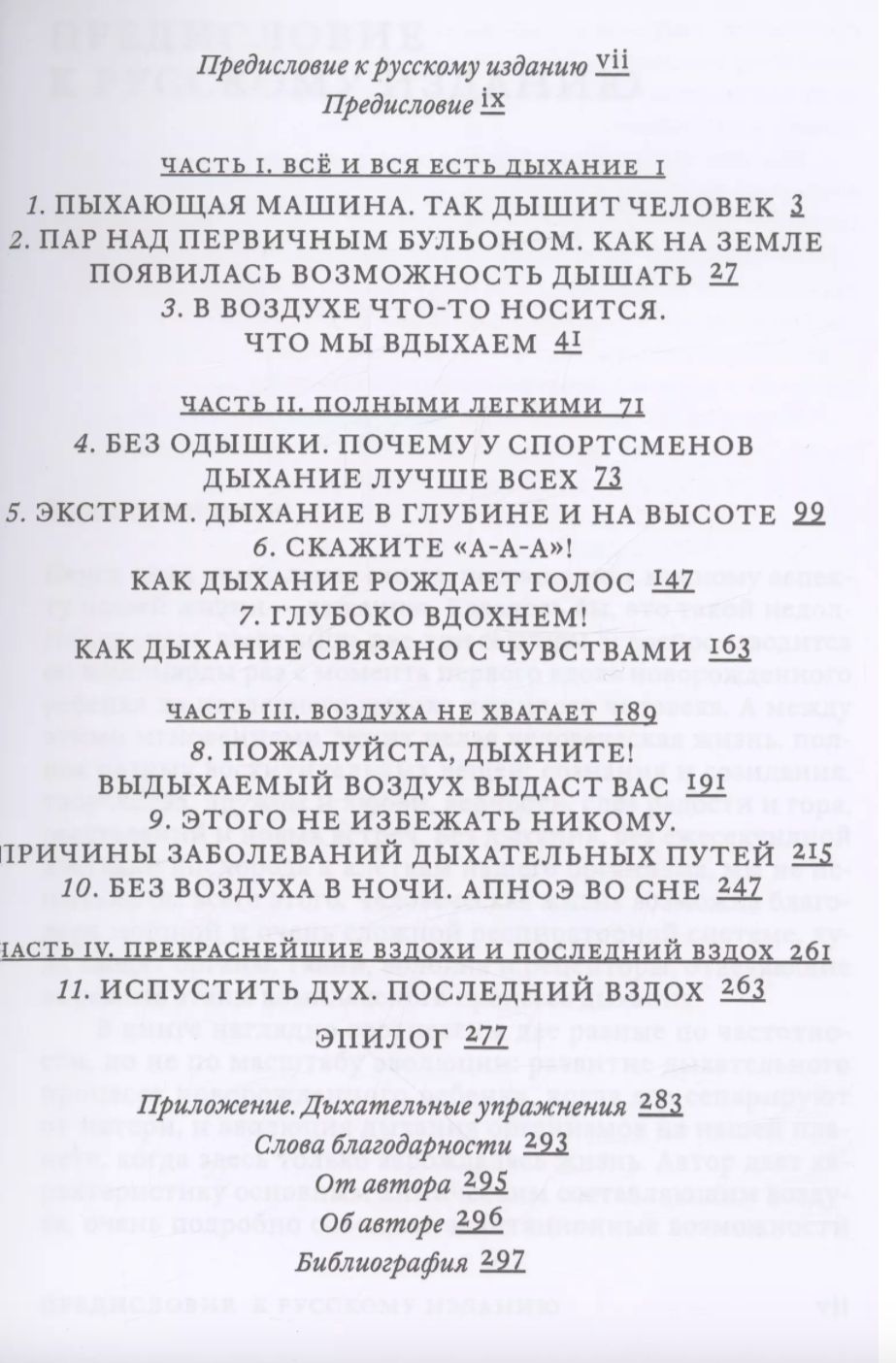 Без дыхания жизнь невозможна: с первым вдохом человек приходит в этот мир, с последним выдохом его покидает. Исследуя феномен дыхания, автор книги Джессика Браун занимается дыхательной гимнастикой вместе с будущими матерями, проводит ночь в лаборатории сна, посещает людей, страдающих хроническим заболеванием легких, медитирует с индийским гуру и ныряет с фридайвером. Она подробно описывает и объясняет все, что происходит с нашим организмом, когда мы дышим. Это позволяет нам увидеть, как соединены в человеке сознание и тело, а также понять, что, овладев искусством дыхания, можно изменить свою жизнь. В издании приводятся специальные упражнения для улучшения дыхательного процесса, для укрепления голоса, для концентрации сознания, для успокоения и здорового сна. Книга весьма познавательна; она предназначена всем, кого интересует, как и чем дышит человек. Она важна и для тех, кто не испытывает проблем с дыханием, и для тех, кому каждый вдох дается с трудом.