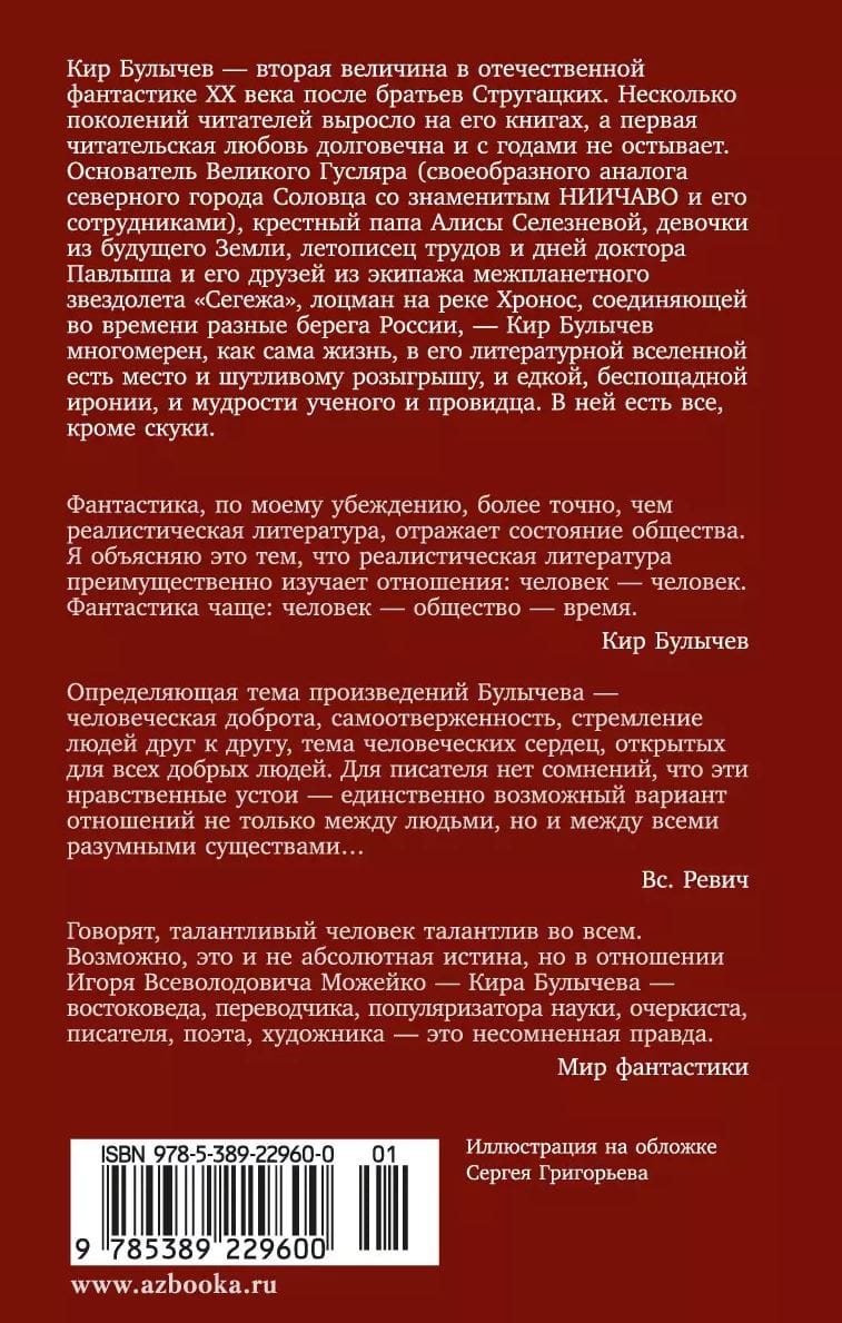 Кир Булычев — вторая величина в отечественной фантастике XX века после братьев Стругацких. Несколько поколений читателей выросло на его книгах, а первая читательская любовь долговечна и с годами не остывает. Основатель Великого Гусляра (своеобразного аналога северного города Соловца со знаменитым НИИЧАВО и его сотрудниками), крестный папа Алисы Селезневой, девочки из будущего Земли, летописец трудов и дней доктора Павлыша и его друзей из экипажа межпланетного звездолета «Сегежа», лоцман на реке Хронос, соединяющей во времени разные берега России…