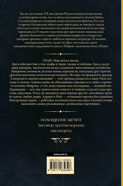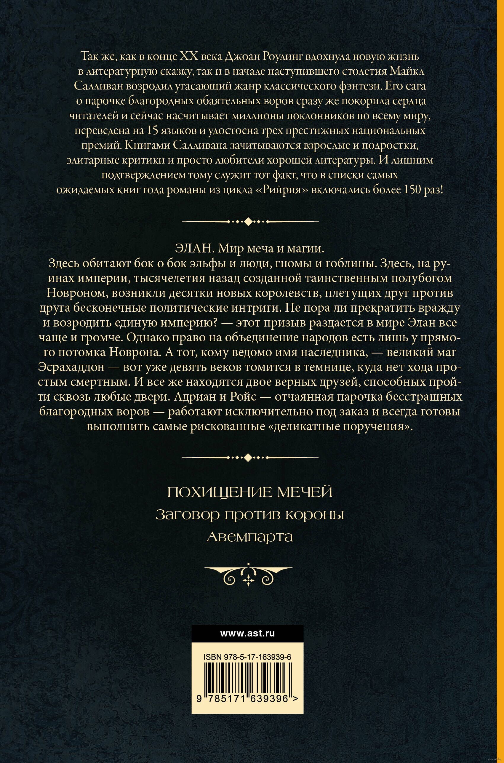 Здесь обитают бок о бок эльфы и люди, гномы и гоблины. Здесь, на руинах империи, тысячелетия назад созданной таинственным полубогом Новроном, возникли десятки новых королевств, плетущих друг против друга бесконечные политические интриги. Не пора ли прекратить вражду и возродить единую империю? – этот призыв раздается в мире Элан все чаще и громче. Однако право на объединение народов есть лишь у прямого потомка Новрона. А тот, кому ведомо имя наследника, – великий маг Эсрахаддон – вот уже девять веков томится в темнице, куда нет хода простым смертным. И все же находятся двое верных друзей, способных пройти сквозь любые двери. Адриан и Ройс – отчаянная парочка бесстрашных благородных воров – работают исключительно под заказ и всегда готовы выполнить самые рискованные «деликатные поручения».