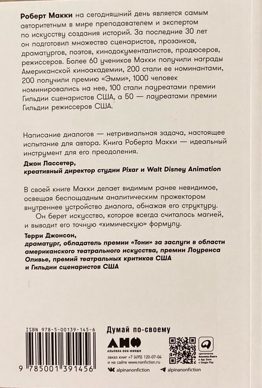 В книге Роберт Макки — американский сценарист и один из наиболее известных в мире преподавателей сценарного искусства, автор знаменитого бестселлера «История на миллион долларов» — раскрывает секреты создания драматического диалога, отталкиваясь от его функции, содержания, формы и техники речи действующих лиц. Это учебник-исследование, в котором рассмотрены как наиболее действенные техники «диалогового письма», так и ошибки, подстерегающие автора в процессе работы, в том числе клише, многословность и неправдоподобие.