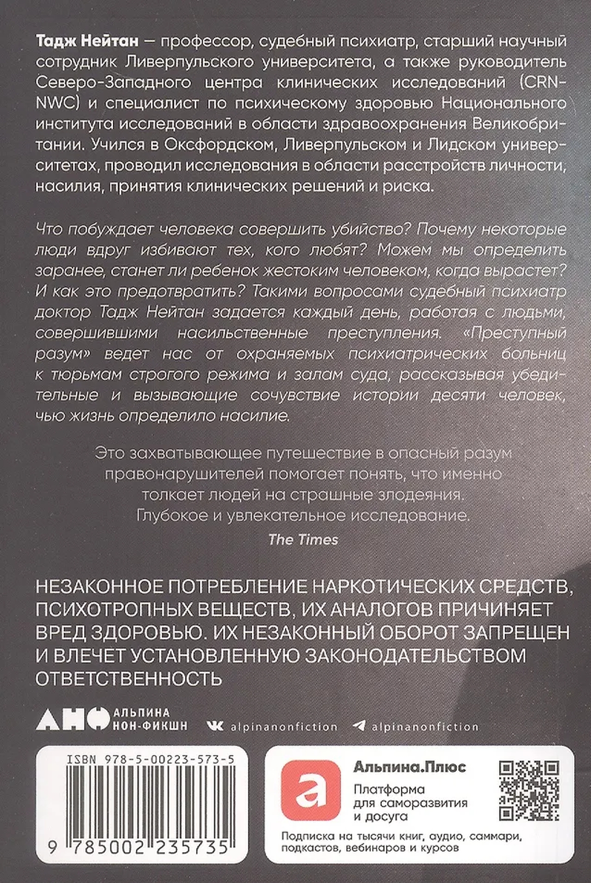 Вдумчивое и увлекательное исследование позволяет читателю не только проникнуть в больничные палаты, тюрьмы строгого режима, в залы судебных заседаний. Глубоко сочувствуя своим подопечным, Нейтан предлагает по-другому взглянуть на людей, скрытых за ярлыками «психопат», «серийный убийца», «сексуальный преступник».