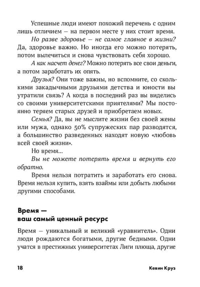 Перед вами книга о тайм-менеджменте... без тайм-менеджмента! Оказывается, действительно успешные люди в своей жизни вовсе не используют приемы, о которых традиционно говорят специалисты по управлению временем. Кевин Круз специально изучил привычки нескольких тысяч профессионалов, но так и не нашел никакой взаимосвязи между обучением тайм-менеджменту и продуктивностью, снижением уровня стресса или ощущением счастья.