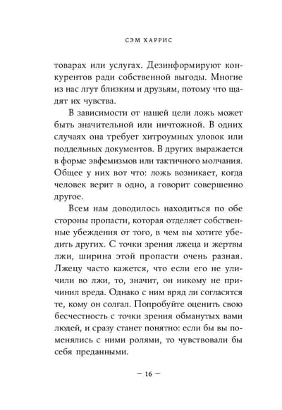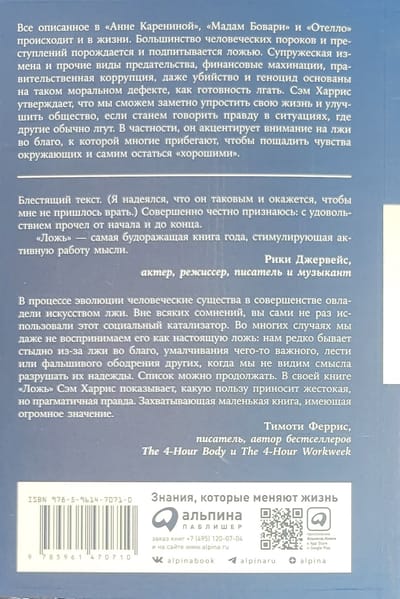 Сэм Харрис препарирует знаменитый «несмертный» грех, выявляя его негативные стороны, и при помощи многочисленных примеров доказывает нам: ложь, даже самая маленькая, ― оружие страшной разрушительной силы. Под его ударами не устоят ни авторитет, ни многолетняя дружба, ни прочные отношения.
