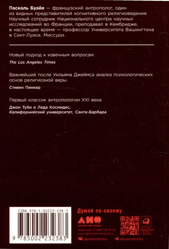 Откуда берется стремление верить в высшие силы? Как возникают религиозные представления и отчего вера продолжает играть столь важную роль в жизни человека ХХТ века? Книга французского антрополога Паскаля Буайе описывает феномен религии с позиций эволюционной психологии. Подоплеку верований и религиозных обрядов ученый находит в принципах работы человеческого сознания. Одну за другой он опровергает распространенные «теории» происхождения религии — она возникла, чтобы объяснять непонятные природные явления и личные переживания, она утешает, она обеспечивает общественный порядок — и раскрывает перед читателем удивительные особенности устройства нашего разума.