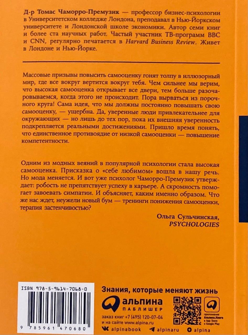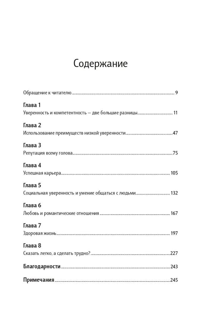 Автор убедительно разоблачает заносчивую самоуверенность, которую общество пытается навязать в качестве эталона, и последовательно истолковывает все сомнения своих менее уверенных в себе читателей в их пользу. А как иначе, если столь ценимая большинством высокая самооценка способна заметно испортить жизнь, загубить здоровье и заставить всех тебя ненавидеть? В реальности именно неуверенность позволяет признать наши несовершенства, а значит, подталкивает к переменам, улучшению жизни и повышению компетентности — и в конечном счете приводит нас к успеху.