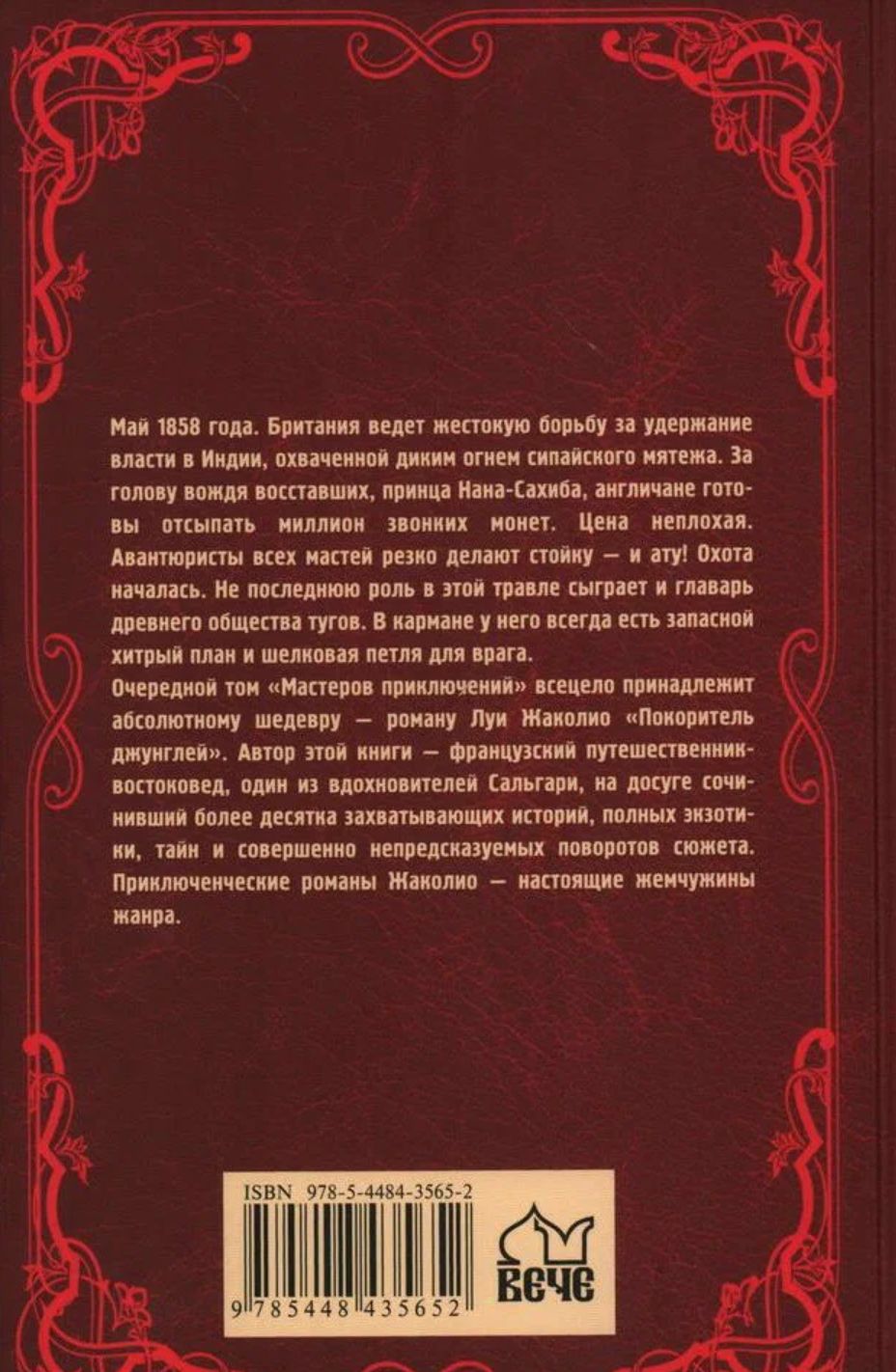 Май 1858 года. Британия ведет жестокую борьбу за удержание власти в Индии, охваченной диким огнем сипайского мятежа. За голову вождя восставших, принца Нана-Сахиба, англичане готовы отсыпать миллион звонких монет. Цена неплохая. Авантюристы всех мастей резко делают стойку — и ату! Охота началась. Не последнюю роль в этой травле сыграет и главарь древнего общества тугов. В кармане у него всегда есть запасной хитрый план и шелковая петля для врага. Очередной том «Мастеров приключений» всецело принадлежит абсолютному шедевру — роману Луи Жаколио «Покоритель джунглей». Автор этой книги — французский путешественник-востоковед, один из вдохновителей Сальгари, на досуге сочинивший более десятка захватывающих историй, полных экзотики, тайн и совершенно непредсказуемых поворотов сюжета. Приключенческие романы Жаколио — настоящие жемчужины жанра.