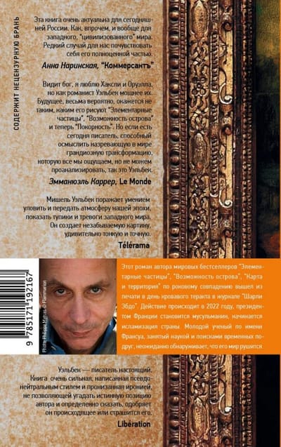 Блестящий и непредсказуемый Мишель Уэльбек — один из самых знаменитых писателей планеты, автор мировых бестселлеров «Элементарные частицы», «Платформа», «Возможность острова», «Карта и территория» (Гонкуровская премия 2010 года). Его шестой роман «Покорность» по роковому совпадению попал на прилавки в день кровавого теракта в журнале «Шарли Эбдо», посвятившем номер выходу этой книги. «Покорность» повествует о крахе в недалеком будущем современной политической системы Франции. Сам Уэльбек определил жанр своего романа как «политическую фантастику».