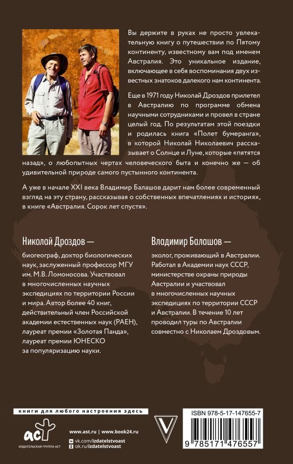 В книге «Полет бумеранга. Австралия. Сорок лет спустя» два известных знатока Австралии делятся своими воспоминаниями об увлекательных путешествиях по далекому Пятому континенту. Еще в 1971 года Николай Дроздов прилетел в Австралию по программе обмена научными сотрудниками и провел в стране целый год. По результатам этой поездки и родилась книга «Полет бумеранга», в которой Николай Николаевич в своей необычайно занимательной манере рассказывает о Солнце и Луне, которые «пятятся назад», о любопытных чертах человеческого быта и конечно же - об удивительной природе самого пустынного континента. Владимир Балашов дарит нам более современный взгляд на эту страну, рассказывая о собственных впечатлениях и историях во второй части книги «Австралия. Сорок лет спустя».