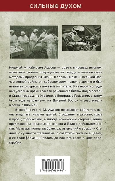 Николай Михайлович Амосов – врач с мировым именем, известный своими операциями на сердце и уникальными методами продления жизни. В первый же день Великой Отечественной войны он добровольцем пошел в армию и был назначен хирургом в полевой госпиталь. В невероятно трудных условиях врачи спасали раненых в битвах под Москвой и Сталинградом, на Украине, в Венгрии, в Германии, а затем были направлены на Дальний Восток и участвовали в войне с Японией.