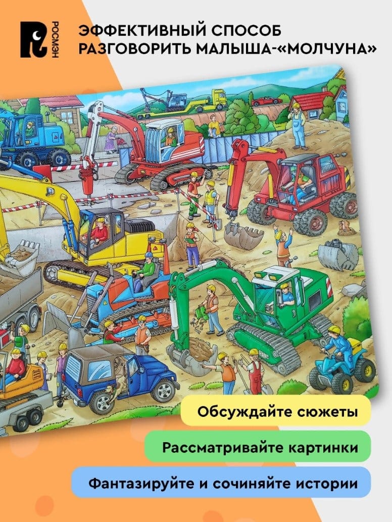 Виммельбух - это книжка-картинка, которую ребенок может разглядывать бесконечно. На стройке работа кипит! Большие машины выполняют сложные задачи: копают землю, прокладывают дороги и перевозят грузы. Совсем скоро на месте стройки будут новые дома и детские площадки! А пока рассматривайте картинки и следите за работой самых разных экскаваторов: красного с двойными шинами, жёлтого цепного, маленького оранжевого и многих других.