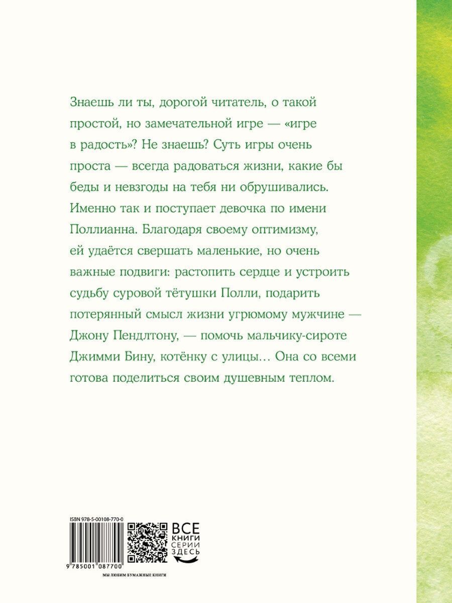 Знаешь ли ты, дорогой читатель, о такой простой, но замечательной игре — «игре в радость»? Не знаешь? Суть игры очень проста — всегда радоваться жизни, какие бы беды и невзгоды на тебя ни обрушивались. Именно так и поступает девочка по имени Поллианна. Благодаря своему оптимизму, ей удаётся свершать маленькие, но очень важные подвиги: растопить сердце и устроить судьбу суровой тётушки Полли, подарить потерянный смысл жизни угрюмому мужчине — Джону Пендлтону, — помочь мальчику-сироте Джимми Бину, котёнку с улицы… Она со всеми готова поделиться своим душевным теплом. Именно поэтому роман американской писательницы Элинор Портер «Поллианна» так полюбился читателям по всему миру. Эта душевная история дополнена иллюстрациями художницы Ани Доброчасовой, которые помогают погрузиться в чудесную атмосферу этой книги!