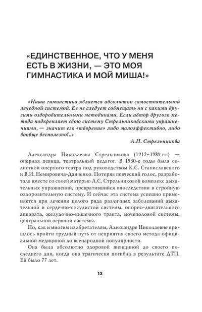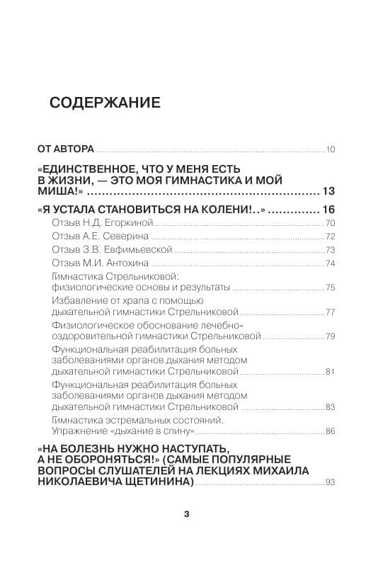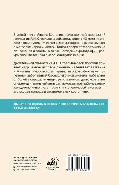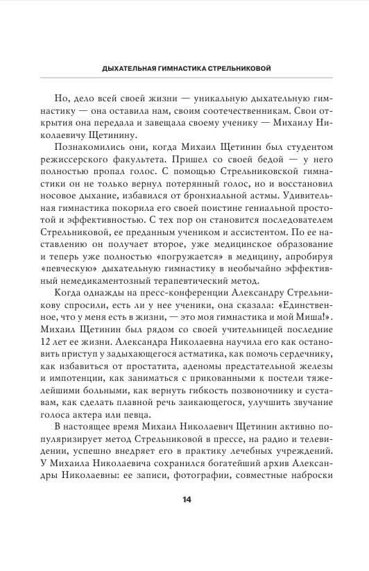 В своей книге Михаил Щетинин, единственный творческий наследник А.Н. Стрельниковой, специалист с 40-летним стажем и с опытом клинической работы, подробно рассказывает о методике Стрельниковой. Книга содержит теоретические объяснения и советы, а также наглядные фотографии, раскрывающие техники выполнения упражнений.