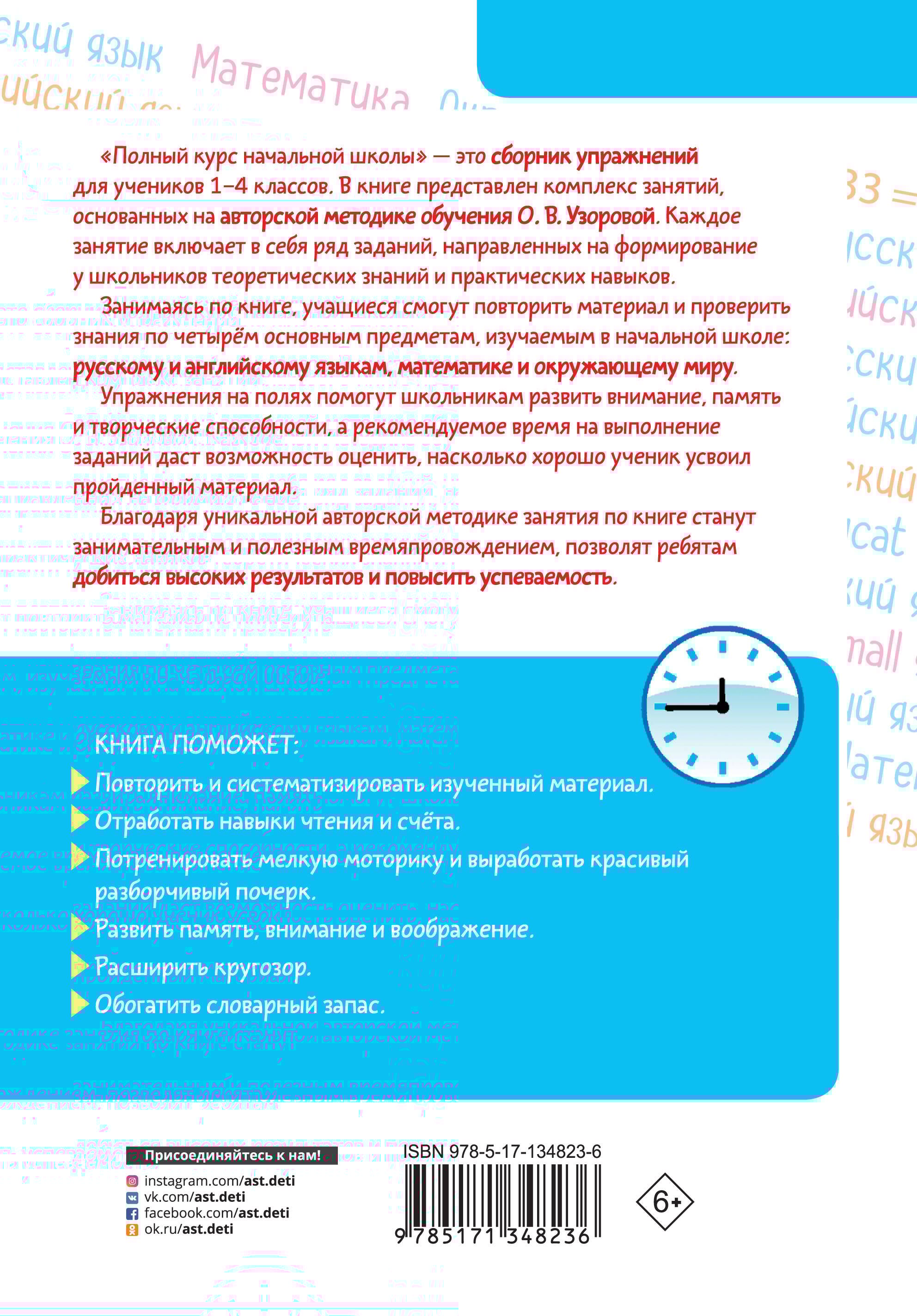 Книга известных педагогов-практиков О. Е. Узоровой и Е. А. Нефёдовой «Полный курс начальной школы. Все типы и все виды заданий для обучения и проверки знаний. 40 000 заданий и упражнений с ответами» — это сборник упражнений для повторения и отработки пройденного материала по предметам »Русский язык», «Математика», «Английский язык» и «Окружающий мир».