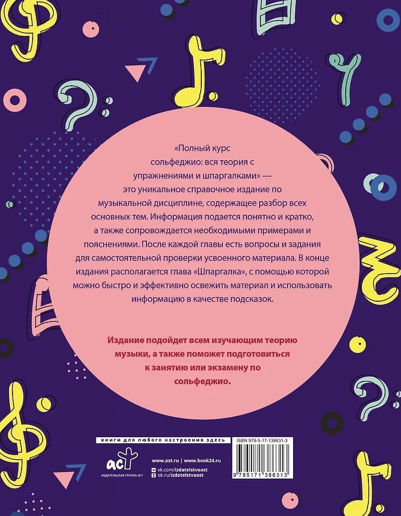 Полный курс сольфеджио: вся теория с упражнениями и шпаргалками» - удобное справочное издание, содержащее в себе объяснение всех тем по теории музыки на основе традиционной программы сольфеджио детских музыкальных школ с учетом требований к вступительным экзаменам в ведущие музыкальные колледжи и ВУЗы (как академические, так и эстрадно-джазовые). Материал преподносится максимально доступно и кратко, сопровождается необходимыми примерами и пояснениями. После каждой главы есть вопросы и задания для самостоятельной проверки усвоенного материала. В конце издания располагается глава «Шпаргалка», с помощью которой можно быстро и эффективно освежить материал и использовать информацию в качестве подсказок.