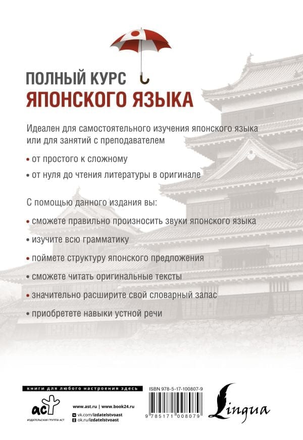 Полный курс японского языка состоит из 11 уроков, позволяющих научиться читать и писать, усвоить основные правила грамматики, познакомиться с особенностями частей речи и синтаксиса, приобрести большой запас слов и выражений, овладеть навыками разговорной речи. Во всех грамматических темах даются упражнения для отработки практических навыков. В конце пособия даны ключи, по которым можно проверить себя. Все диалоги, тексты и большое количество упражнений можно прослушать на CD, записанном носителями языка. Книга подходит как для самостоятельного изучения японского языка, так и для занятий с преподавателем. Кроме того, это издание может служить прекрасным справочным пособием по грамматике для тех, кто хочет усовершенствовать свои знания.
