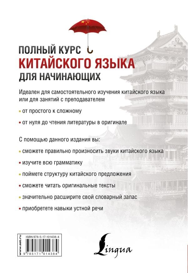 Полный курс китайского языка состоит из 15 уроков, позволяющих научиться читать и писать, усвоить основные правила грамматики, познакомиться с особенностями частей речи и синтаксиса, приобрести большой запас слов и выражений, овладеть навыками разговорной речи. Во всех грамматических темах даются упражнения для отработки практических навыков. В конце пособия даны ответы, по которым можно проверить себя. Все диалоги, тексты и большое количество упражнений можно прослушать на CD, записанном носителями языка. Книга подходит как для самостоятельного изучения китайского языка, так и для занятий с преподавателем. Кроме того, это издание может служить прекрасным справочным пособием по грамматике для тех, кто хочет усовершенствовать свои знания.