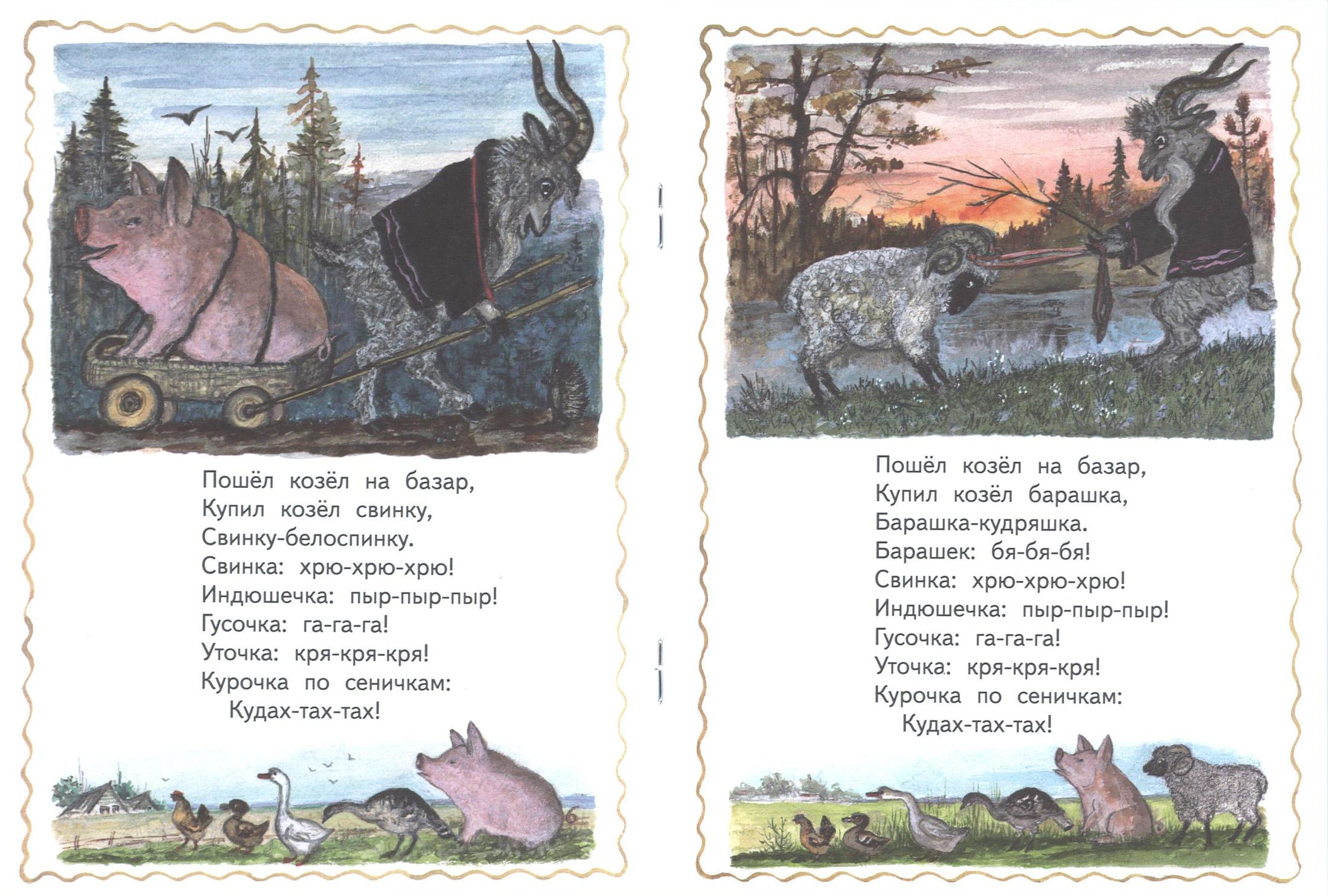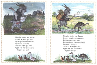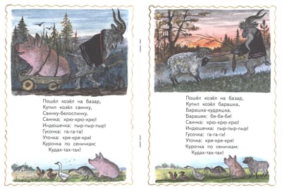 Эта песенка поможет малышу запомнить названия, внешний вид и повадки домашних животных, кроме того, она хорошо подходит для совместной игры с другими детьми или игрушками. А иллюстрации Юрия Васнецова перенесут родителей в их собственное детство.