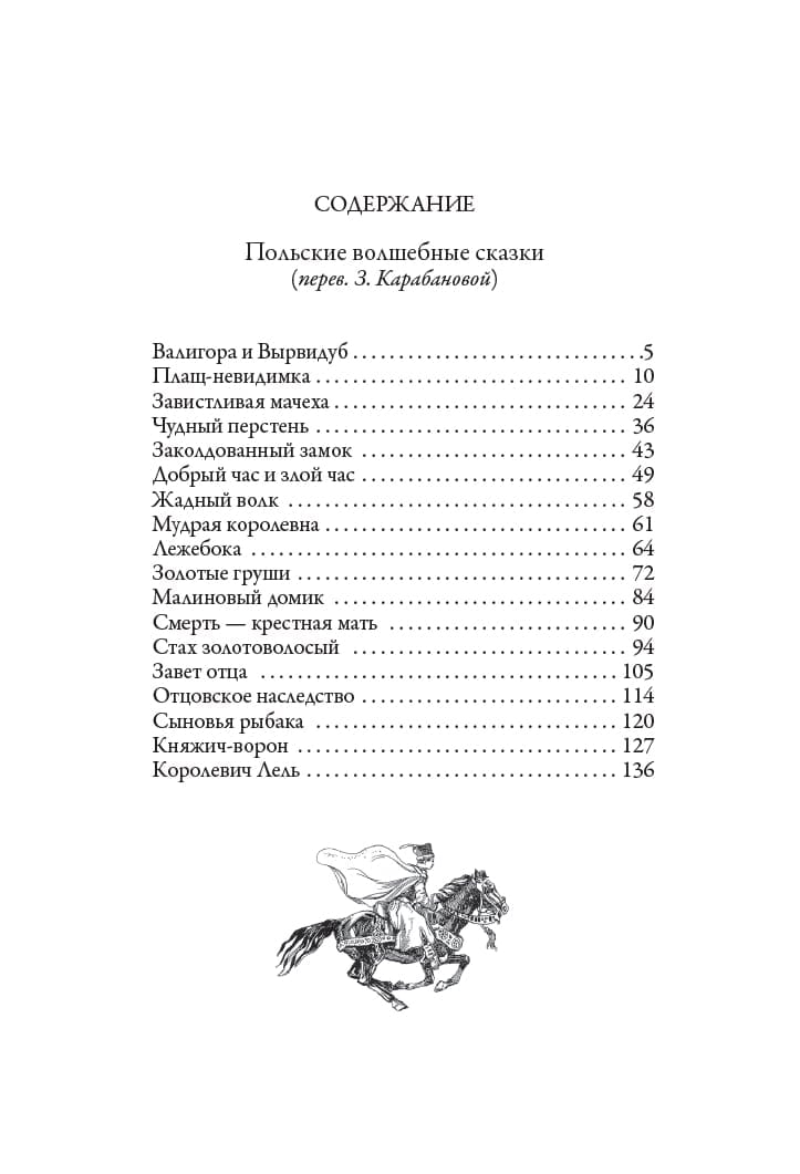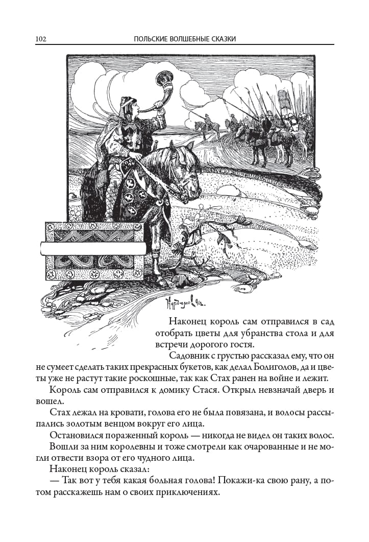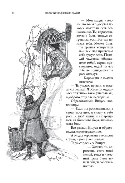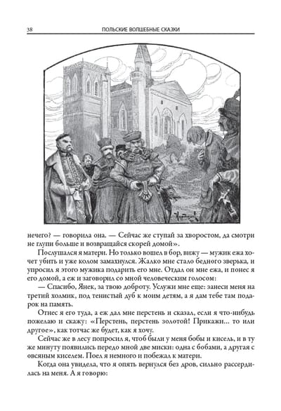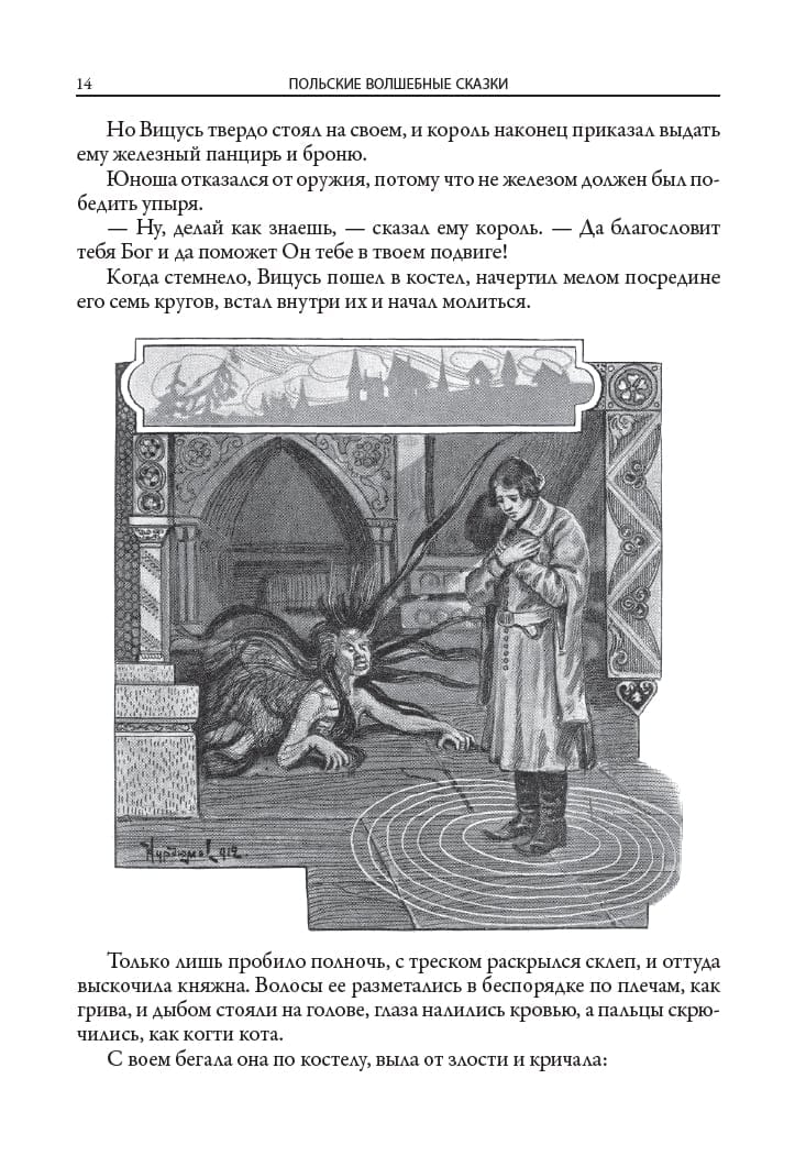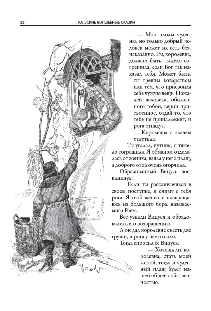 Книга включает восемнадцать польских народных сказок. Некоторые из них напоминают известные русские сказки, другие совершенно своеобразны; есть в сборнике сказки и с мистической подоплекой. Все тексты даны в переводе З. Карабановой. Издание украшают иллюстрации известного русского художника, работавшего на рубеже XIX и XX веков и внесшего заметный вклад в развитие русского модерна, Валерия Николаевича Курдюмова. Важную роль в формировании культуры каждого народа играет его фольклор: былины, саги, сказки. Эта книга знакомит читателей со сказками старой Польши. В них отразились особенности повседневной жизни поляков прошлых веков, их быта, образа мыслей, верований. И конечно же, как и в сказках других народов мира, в этих сказках много волшебного, таинственного, мистического, а порой и пугающего. Сюжеты некоторых польских сказок по своей конструкции напоминаю русские повести или сказки, другие на них вовсе не похожи. К примеру, сюжет сказки «Плащ-невидимка» немного напоминает гоголевского «Вия», а сказка «Чудный перстень» местами похожа на известную историю Шергина, в которой пес и кот помогают своему спасителю. С другой стороны, сюжет сказки «Малиновый домик» совершенно оригинален. Сравнение польских сказок, включенных в этот сборник с уже известными вам сказочными сюжетами - интересное занятие. Оно, безусловно, доставит вам удовольствие. Восемнадцать польских сказок, составивших эту книгу, были впервые напечатаны знаменитым московским издателем Иваном Дмитриевичем Сытиным в 1914 году. Он сделал фантастическую карьеру от подручного в книжной лавке до видного книгоиздателя и владельца крупной сети книжных магазинов и лавок. Иван Дмитриевич старался сделать книги недорогими и привлекательными для читателей. Для этого он привлекал к оформлению своей продукции лучших художников России. С Сытиным сотрудничали такие мэтры живописи, как Илья Ефимович Репин и Иван Яковлевич Билибин. Для иллюстрирования сборника польских сказок Сытин привлек к работе талантливого художника Валерия Николаевича Курдюмова. Его рисунки украшают и это современное издание. Достаточно взглянуть на любую его иллюстрацию, чтобы сразу понять - это работа подлинного мастера. Курдюмов прекрасно владел композицией и техникой штрихового рисунка. С помощью тонких линий он прекрасно передавал мех медведя, складки одежды или игру света и тени на камнях в лесной чаще. В его манере чувствуется влияние и уникального билибинского стили, и модных художественных веяний начала ХХ века. Любопытно отметить, что Курдюмов был основателем знаменитого московского дома-коммуны в Лефортове, где проживали и занимались живописью многие художники самых различных направлений. В 1905 году там поселили Казимир Малевич, которого связывали с Курдюмовым теплые дружеские отношения. К сожалению, в истории сохранилось мало сведений о жизни В. Н. Курдюмова; лучшим памятником художника остаются его неподвластные времени рисунки.