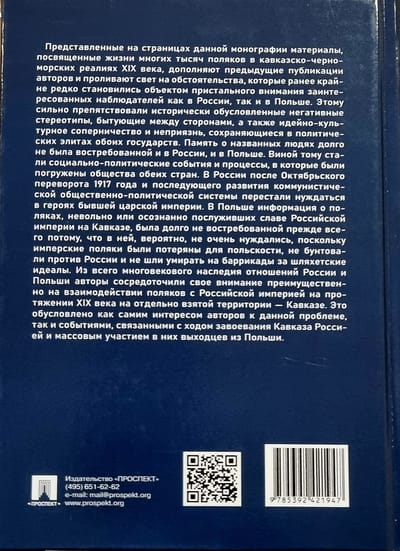 Представленные на страницах данной монографии материалы, посвященные жизни многих тысяч поляков в кавказско-черноморских реалиях XIX века, дополняют предыдущие публикации авторов и проливают свет на обстоятельства, которые ранее крайне редко становились объектом пристального внимания заинтересованных наблюдателей как в России, так и в Польше. Этому сильно препятствовали исторически обусловленные негативные стереотипы, бытующие между сторонами, а также идейно-культурное соперничество и неприязнь, сохраняющиеся в политических элитах обоих государств. Память о названных людях долго не была востребованной и в России, и в Польше. Виной тому стали социально-политические события и процессы, в которые были погружены общества обеих стран.