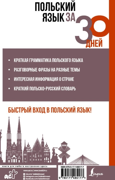 «Польский язык за 30 дней» - это простой и доступный курс польского языка. Самоучитель состоит из трех частей. Краткая грамматика дает основные сведения о строении польского языка. Разговорник содержит наиболее часто употребляемые слова и выражения по самым актуальным темам, а также полезную страноведческую информацию. Польско-русский словарь поможет перевести несложные тексты и подобрать нужные слова для построения фраз.