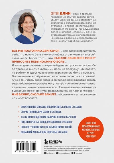 Практически перед каждым в определённый момент жизни встает вопрос – как избавиться от боли и сохранить активность при заболеваниях суставов. На страницах этой книги вас ждут простые и легкие в применении способы профилактики, упражнения, правила жизни и питания, которые помогут восстановить здоровье, если у вас уже есть артрит или артроз. Врач с опытом работы 25 лет, к советам которого прислушиваются более миллиона человек, остеопат, специалист в превентивной и антивозрастной медицине, руководитель клиники лечения болезней суставов – Сергей Длин – расскажет вам на страницах этой книги, как: