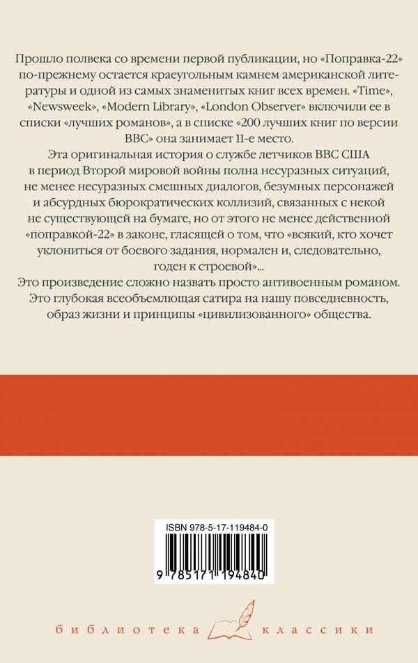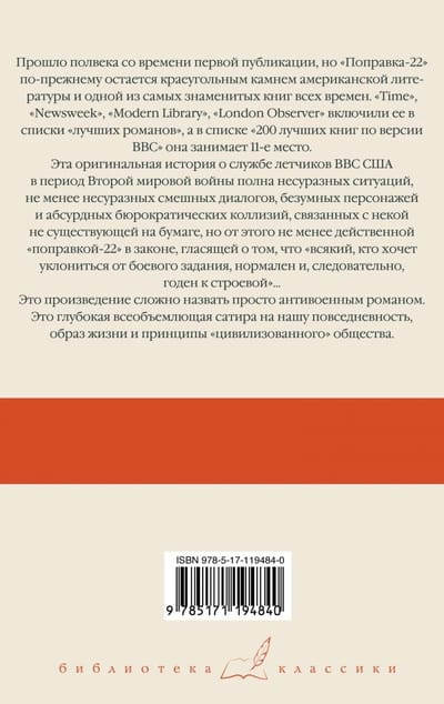 Прошло полвека со времени первой публикации, но "Поправка-22" по-прежнему остается краеугольным камнем американской литературы и одной из самых знаменитых книг всех времен. "Time", "Newsweek", "Modern Library", "London Observer" включили ее в списки "лучших романов", а в списке "200 лучших книг по версии BBC" она занимает 11 место.
