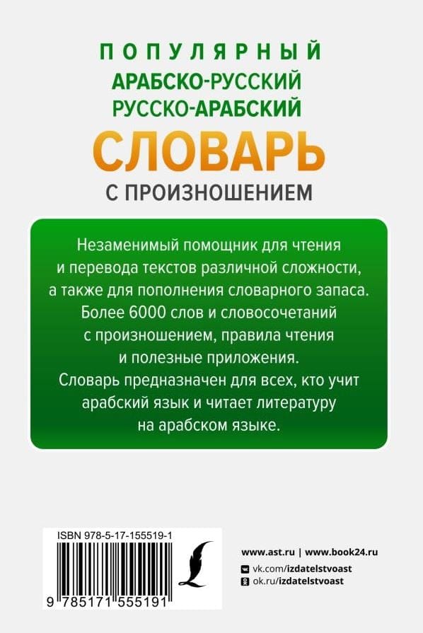 «‎Популярный арабско-русский русско-арабский словарь с произношением»‎ содержит более 6000 слов и словосочетаний с произношением, правила чтения и полезные приложения. Издание станет незаменимым помощником для чтения и перевода текстов различной сложности, а также для пополнения словарного запаса.